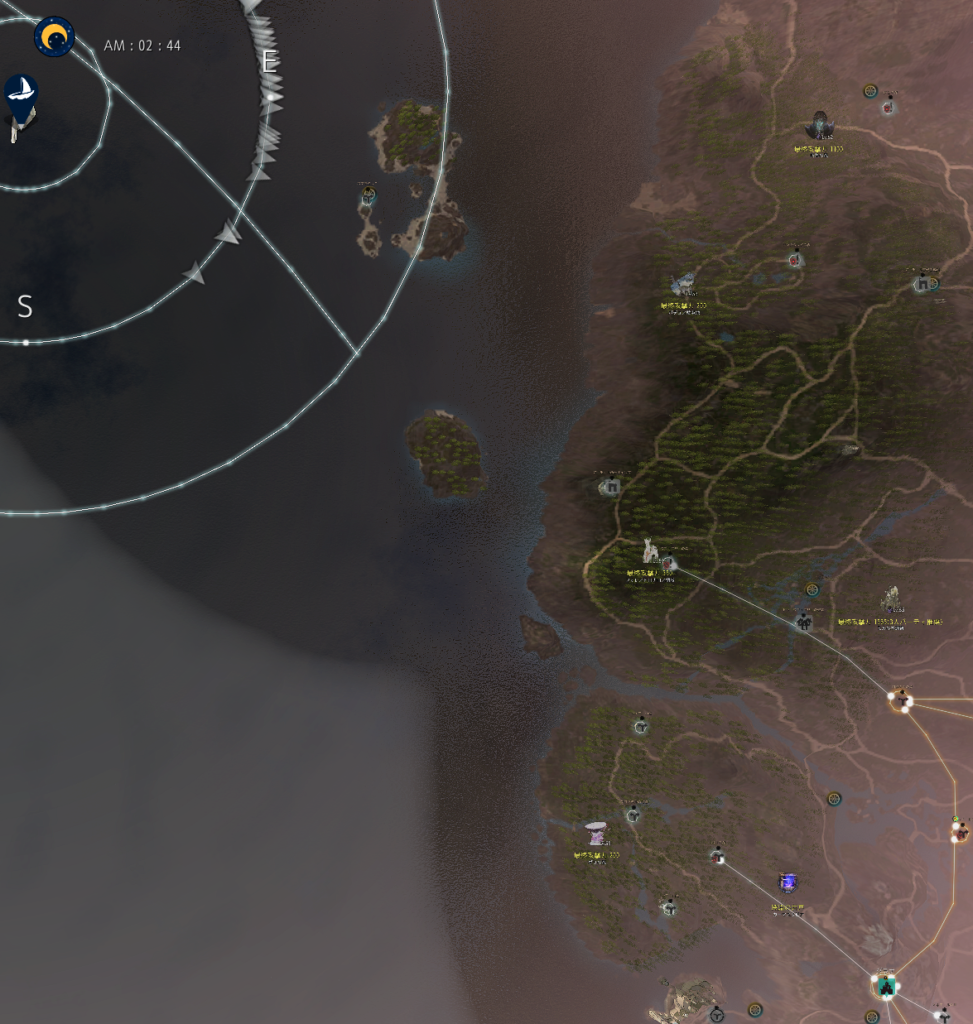この釣り場は非常にアクセスが悪いです。移動を楽にするために「考古学者の地図」があると非常に便利。地図を使って一番近い村へ飛ぶと、アーチェル警備警戒所に帰還できます。