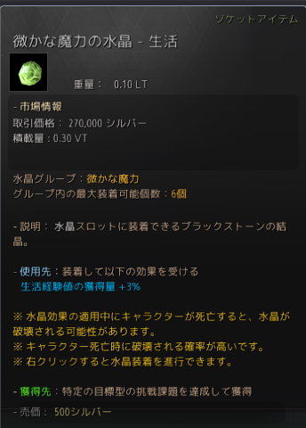 上16か所 | 微かな魔力の水晶 – 生活 | 最大6個 | 生活経験値 +3% | 取引所で安価に購入可能。効果は低いが、水晶を割っても惜しくないため初心者向け。 |