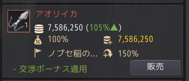今回狙った宝魚「アオリイカ」は、宝魚の中では最も安価な部類に入りますが、それでも1匹あたり原価2,000,000シルバーで売れるため、まとまった数になると大きな収入になります。