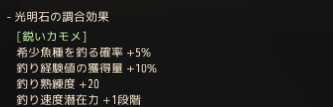 | 浮き | カエデ浮き | レア魚種が釣れる確率アップ。アイテム刻印呪文石の使用も推奨されます。+10強化を目指しましょう。 |