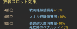 - 衣装セット効果:武器・防具、衣装セット効果で「耐久度減少抵抗」が合計20%〜30%確保でき、長時間放置が可能になります。