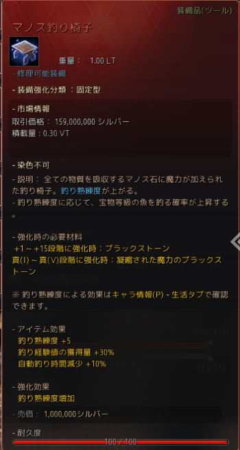 - マノス釣り椅子:無強化でも釣り時間減少10%の効果があり、釣り放置に非常に有効です。椅子は他のクリオ釣り椅子やロッジア釣り椅子を繋ぎに買うのではなく、最初からマノス釣り椅子でもいいと思います。